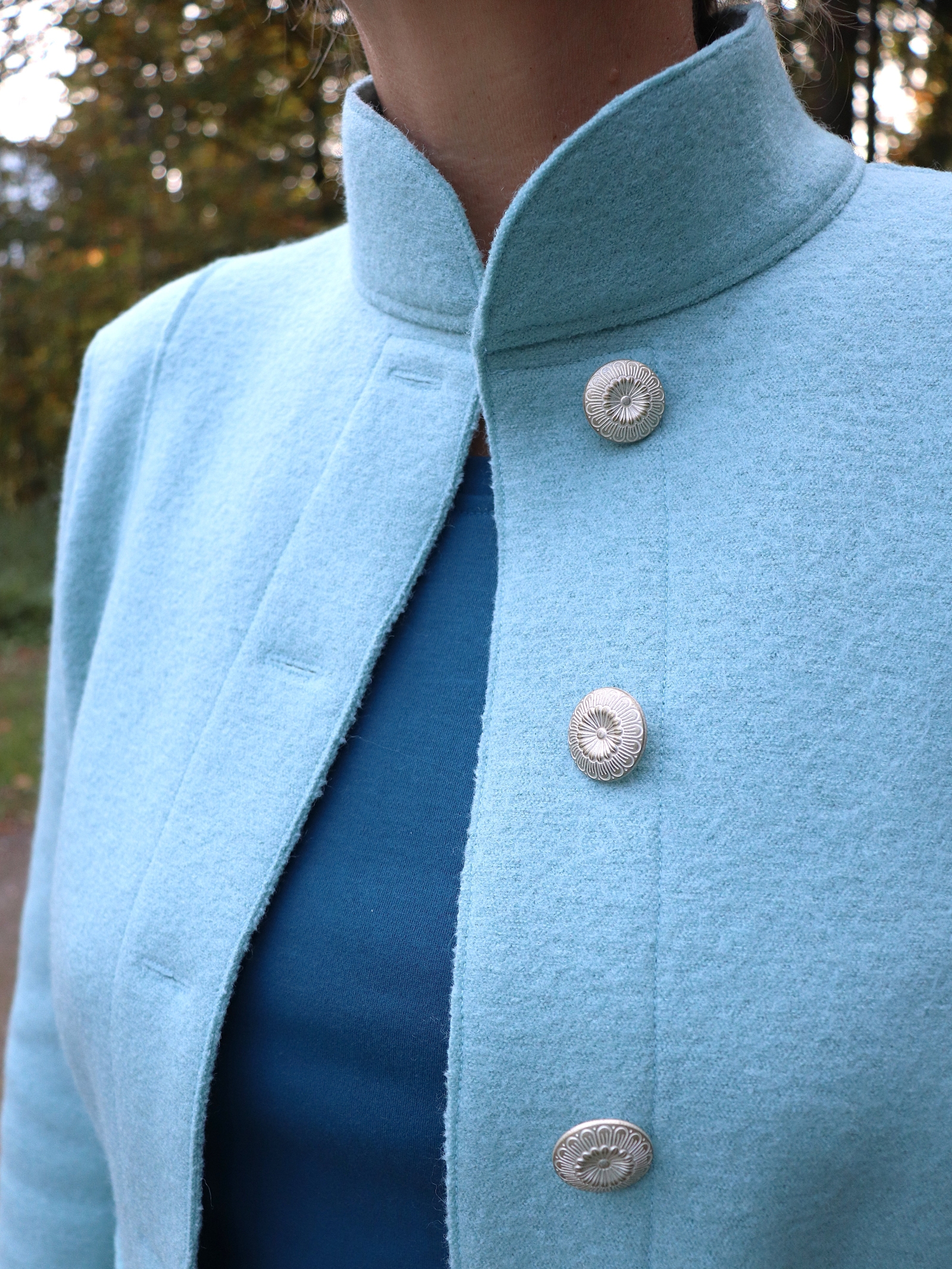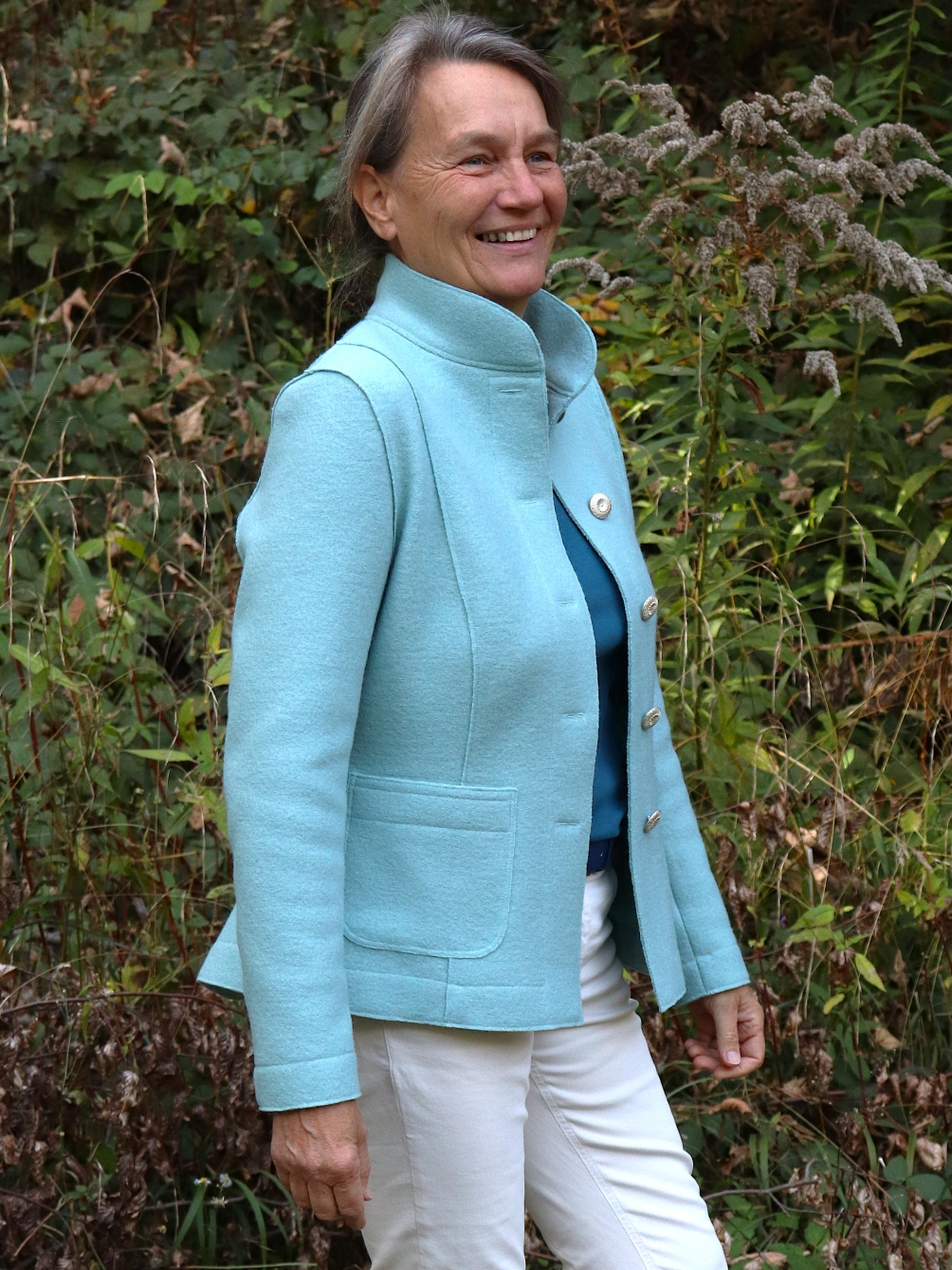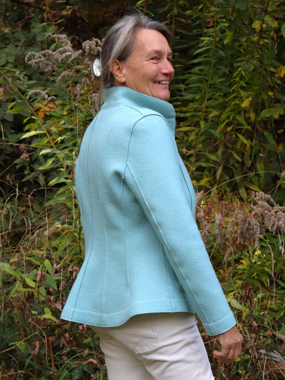Bei der Entwicklung der Damenjacken liegt mein Fokus ganz besonders auf der wunderschönen Ausstrahlung. Ich wollte unbedingt etwas Gestalten und erschaffen das ein ganz besonderes Gefühl beim Tragen auslöst und die Form der Weiblichkeit hervorhebt. Mein Ziel ist es Menschen zu berühren und Dinge zu gestalten die man sowohl am Körper als auch im Innen fühlen kann. Deshalb verwende ich ganz weiche Wollwalkstoffe aus Tirol in denen man sich richtig wohlfühlen kann.